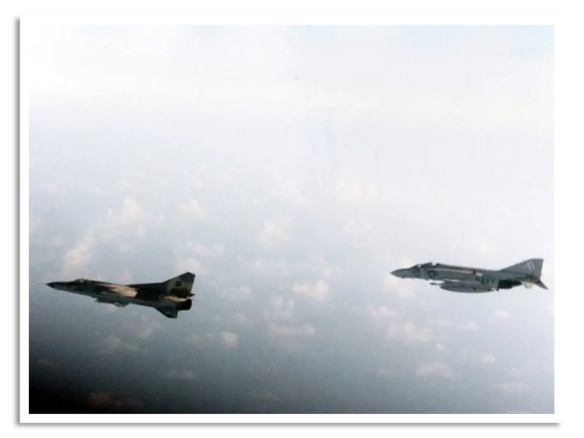 Onderschepping van een Libische MiG-23 door een F-4 Phantom van de USS Forrestal. Foto: U.S. Navy.