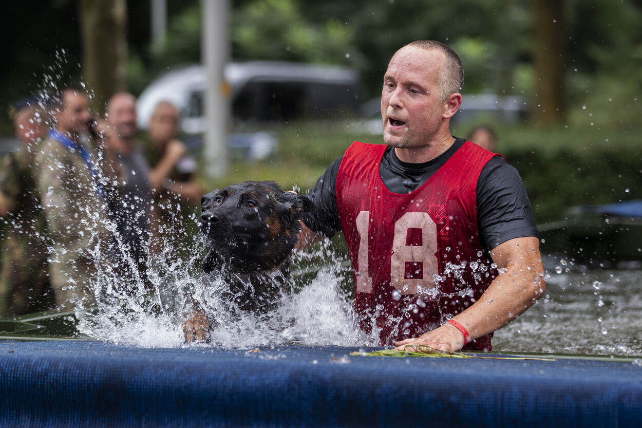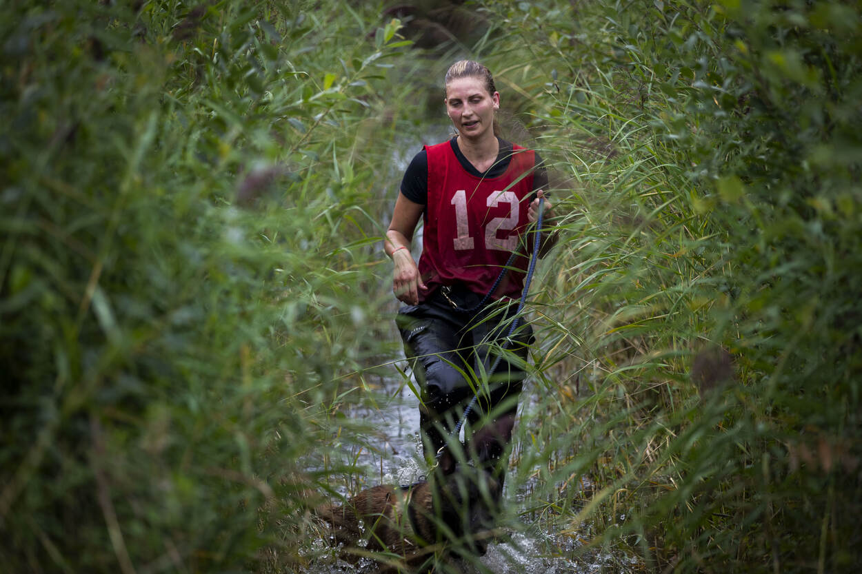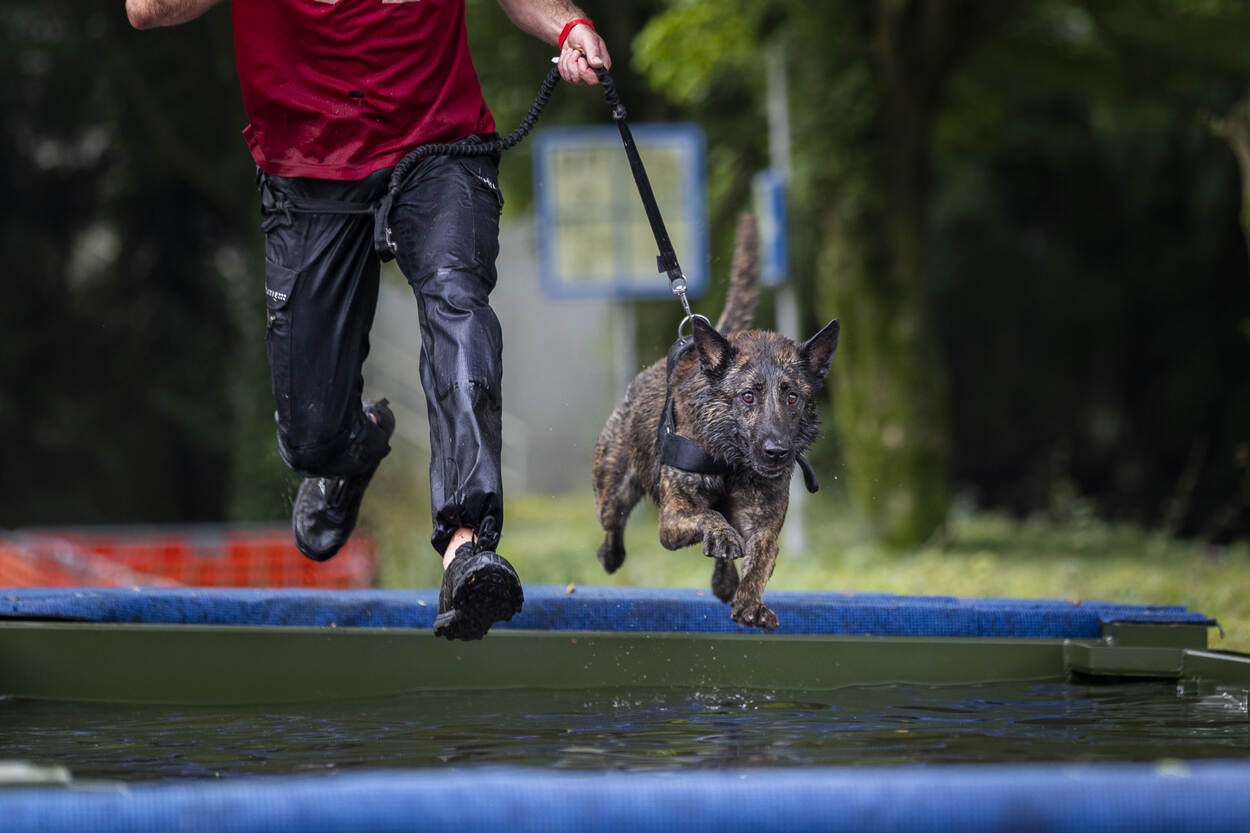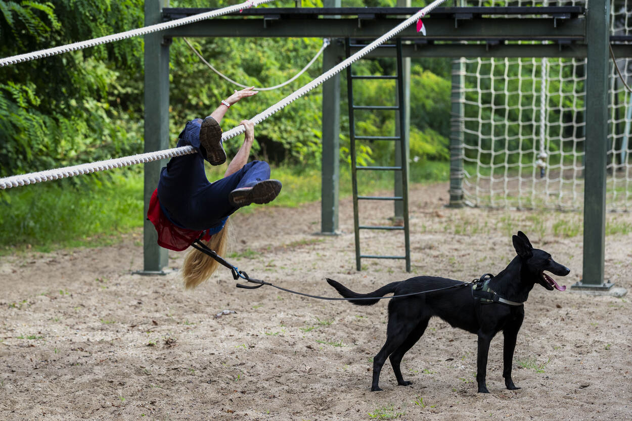 Voor zich ziet de hondenbegeleider een kist van twintig kilo, met daaraan twee touwen. De man staat nog op adem te komen van het oversteken van de sloot. De modderige bodem heeft de benen flink verzuurd. Zijn trouwe viervoeter stuitert vrolijk naast hem op en neer. De ogen strak op de baas gericht, klaar voor de volgende opdracht. Tip van de jury? “Maak het touw niet te lang, daar wordt de opdracht alleen maar zwaarder van.” En daar gaat het 'dierlijke duo'. Ze trotseren hindernis veertien. Nog maar zestien te gaan.