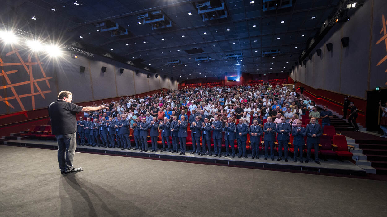 Een half uurtje voor de première dinsdagavond druppelt één van ’s lands grootste bioscoopzalen, het Expotheater in Ede, vol. De ene veteraan draagt trots z’n onderscheidingen, met of zonder baret. De ander heeft de witte anjer op de borst gespeld. De gasten worden vrolijk verwelkomd door de vrijwillige drumfanfare Koninklijke Luchtmacht. Hetzelfde orkest als in de film te zien is, wanneer majoor Kroon de Militaire Willems-Orde krijgt.