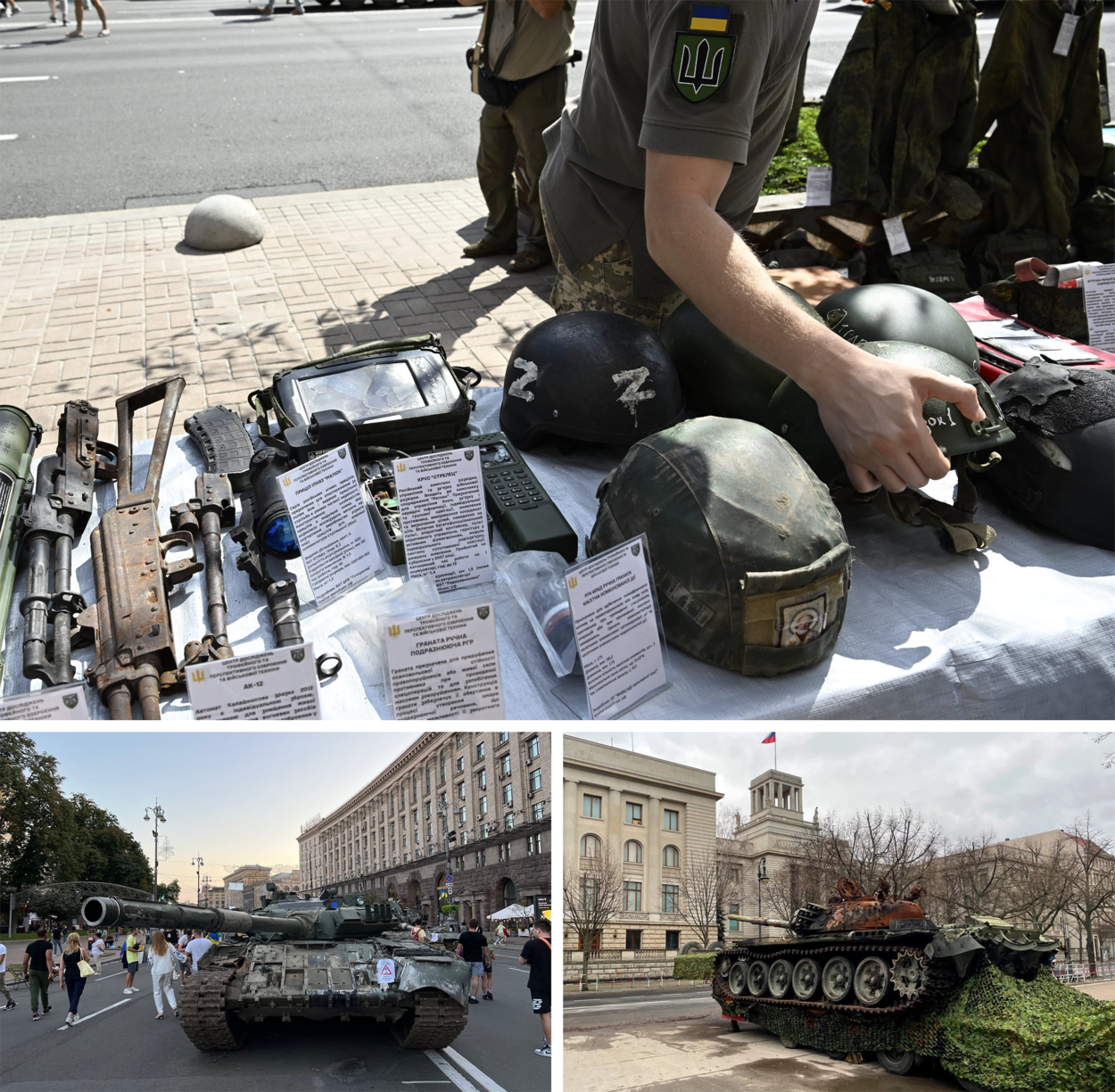 Russisch militair materieel zoals wapens en pantservoertuigen werden tentoongesteld in Kiev, tijdens de viering van de onafhankelijkheid van het land op 24 augustus.