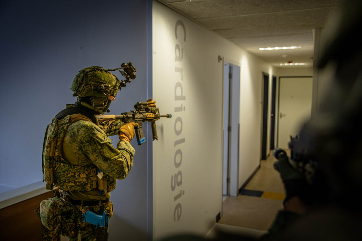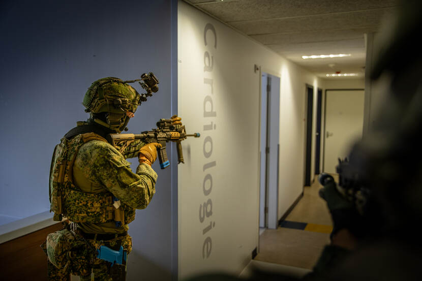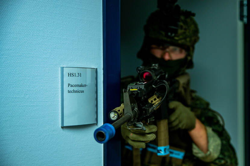 Via de voormalig hoofdingang waar patiënten zich eerder dit jaar nog naar hun afspraken spoedden, zijn het nu mariniers die doorlopen naar wachtkamer 2A. Op de muur staat ‘neemt u plaats’, maar de militairen laden hier hun wapens. Dan roept iemand ‘PLAY!’ en het scenario begint. Volgens de aangeleerde procedures speuren de mariniers de gangen van poli’s 2, 4, 5 en 6 zorgvuldig af. Langs de gipskamer, richting cardiologie.