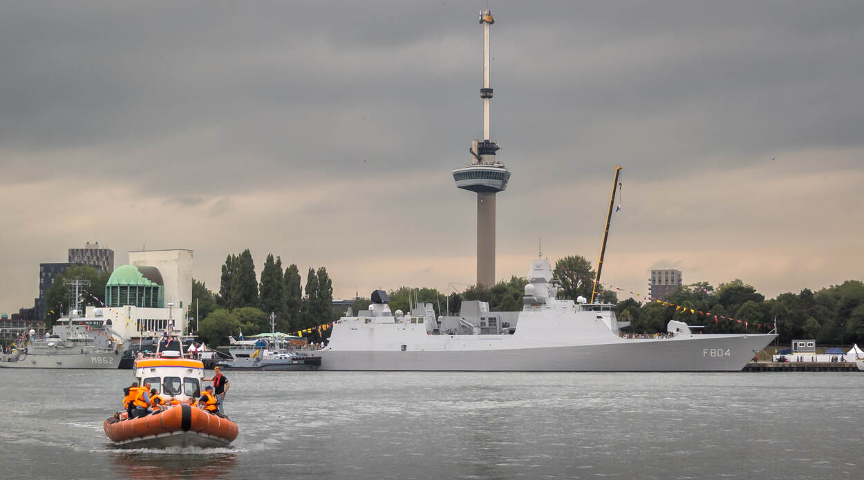 Het is alweer even geleden, maar een terugblik naar de Wereldhavendagen in Rotterdam begin september is nooit verkeerd. Voor de 46e keer was ook de Koninklijke Marine vertegenwoordigd. Dit keer gaf Zr.Ms. De Ruyter acte de préséance, zoals Martin Bos op deze foto vastlegde. Het luchtverdedigings- en commandofregat lag afgemeerd in de nabijheid van het handelsmerk van de Maasstad. Ook mijnenjager Zr. Ms. Zierikzee, het hydrografisch opnemingsvaartuig Zr. Ms. Snellius en het duikvaartuig Cerberus waren van de partij.