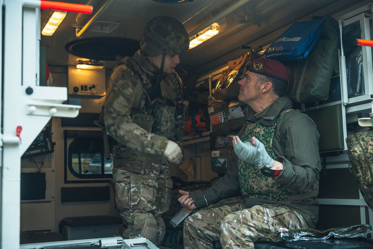 Brigadegeneraal Cas Schreurs kwam een kijkje nemen in Bergen-Hohne. Tijdens een van de scenario’s speelde hij een vip die bij een aanval gewond raakt aan zijn hand.