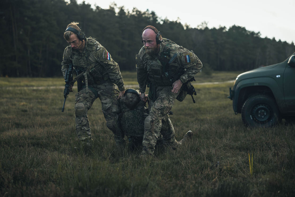 Militairen brengen een ‘gewonde’ collega op de schietbaan in veiligheid.