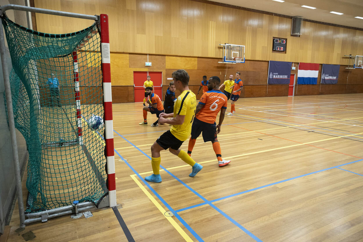 Vroeger had je het gewoon over zaalvoetbal, maar opeens moest het om een of andere reden op z’n Brazilaans ‘futsal’ heten. Vooruit dan maar. Tijdens het defensiekampioenschap in Den Helder maalden de deelnemers niet om de naam van het toernooi. Het gaat hun om de punten! Doelpunten welteverstaan, maar het is de vraag of er op deze foto wordt gescoord tegen het vijftal van de luchtmacht.