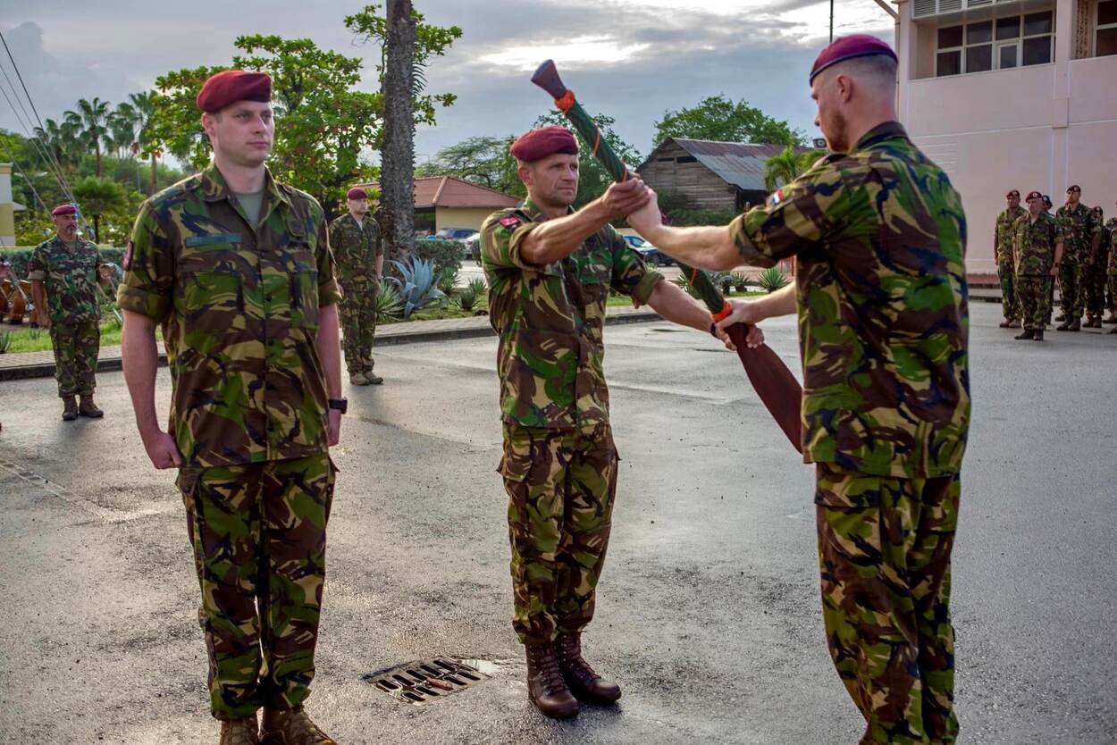 Tijdens een korte ceremonie heeft de zogenoemde Compagnie in de West de taken overgedragen aan rotatie 44. Dat gebeurt traditioneel met het overhandigen van een peddel. De Alfa ‘Koningscompagnie’ nam afscheid van haar periode op het tropische eiland. De Charlie ‘Tijgercompagnie’, ook van 11 Infanteriebataljon Luchtmobiel, neemt de taken nu waar.