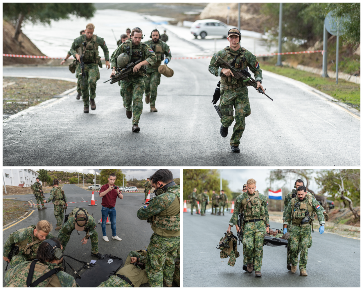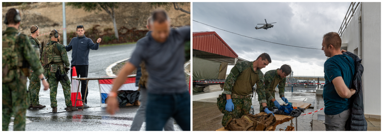 De oefen-NEO over zee vindt plaats bij een Cypriotische marinebasis, nabij de zuidelijke havenstad Limasol. In het scenario van de 'full dress rehearsel' evacueren de militairen mensen uit een crisisgebied in het Midden-Oosten. Op Cyprus woonachtige Nederlandse gezinnen met kinderen nemen deel aan de oefening en spelen hun rol van evacuee met verve. Dat maakt het geheel een stuk realistischer. In het scenario is het niet mogelijk om aan te meren aan de kade vanwege de ‘crisissituatie’. Dus de evacuees moeten per FRISC en helikopter naar het schip gebracht worden. Een flinke logistieke uitdaging. De eenheden moeten onder grote tijdsdruk beslissingen nemen, want mensen willen het ‘crisisgebied’ met spoed verlaten. Is er alweer een FRISC of een heli beschikbaar? Wie vertrekt in welk voertuig? Is de persoonslijst al compleet? Niet alleen onderlinge coördinatie is essentieel, ook afstemming met internationale partners is een vereiste. Want ook andere landen halen hun onderdanen terug in een reële situatie. En dat moet allemaal tegelijkertijd gebeuren, te midden van de chaos. Dat maakt het optreden behoorlijk complex. De operatie op de grond, in de haven en op zee verschilt niet wezenlijk van vorige maand uitgevoerde oefen-NEO’s op een luchthaven. Dat betekent dat de mariniers opnieuw meerdere checkpoints inrichten voor het begeleiden van de evacuees richting het schip. De mariniers van de doorlopend gereedstaande MSTU doen onder meer de ontvangst van evacuees bij de ingang van de haven, de controle op verboden voorwerpen en het beheer van wachtruimtes. Ook de leden van het Snel Consulair Ondersteuning Team (SCOT) van het ministerie van Buitenlandse Zaken nemen weer deel. Ze controleren de identiteit van de evacuees en ondersteunen bij de evacuatie. 'Go, go, go!' Een van de mariniers is ‘gewond’ geraakt en heeft dringend hulp nodig. Dat heeft hoge prioriteit. Een zogeheten 'Quick Reaction Force' spoedt zich naar de collega voor assistentie. Gewonde evacuees vliegen per heli naar het schip. Daar worden ze - onderweg naar veilige haven - door de medische dienst verder geholpen. Vorige maand werden er NEO's geoefend met een C-130 Hercules-transsporttoestel. Dat gebeurt ditmaal dus met een patrouilleschip. Een schip doet er langer over om ter plaatse te zijn dan een C-130, maar kan wel meer evacuees meenemen en is flexibeler in beweging. En zo waren er nog meer verschillen ten opzichte van eerdere oefeningen met het transporttoestel.