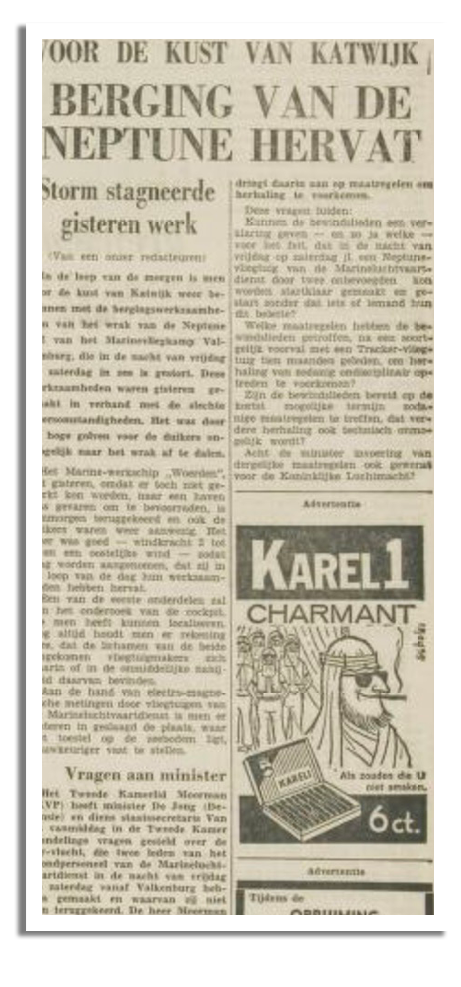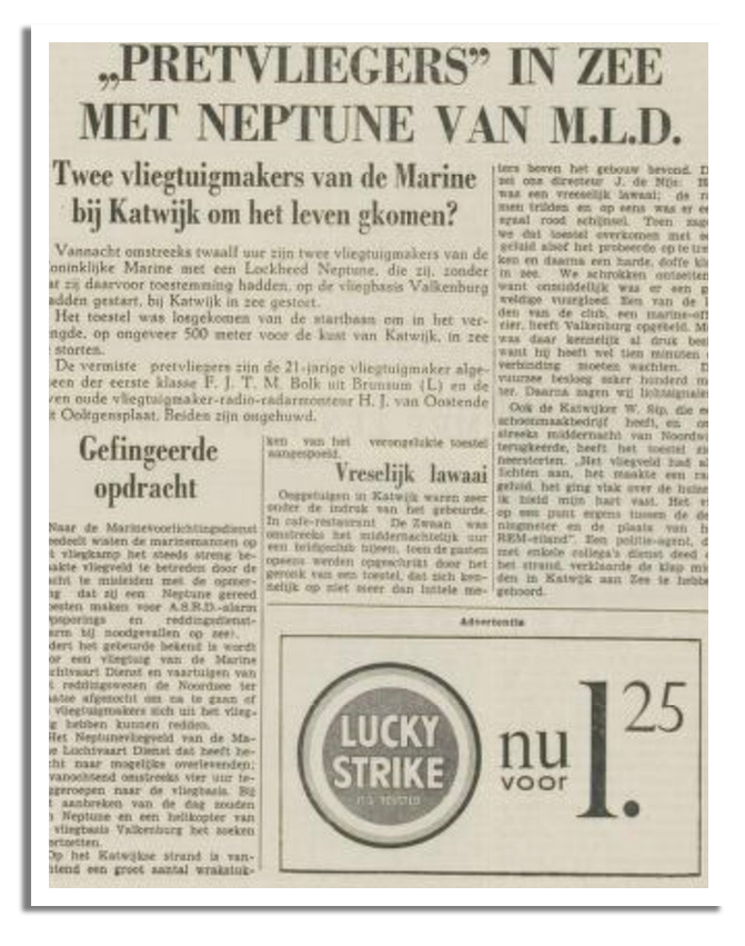 De gezondheidstoestand van Winston Churchill - hij overlijdt op 24 januari - houdt de gemoederen die eerste weken van het nieuwe jaar bezig. Het neerstorten van een Lockheed Neptune SP-2H van de Marine Luchtvaartdienst (MLD) haalt natuurlijk ook de voorpagina’s en krijgt ook de week erna de volle aandacht. Want wat heeft zich op Marinevliegkamp Valkenburg afgespeeld en kost twee jonge vliegtuigmonteurs het leven? Die vraag is nu, bijna zestig jaar later, nog steeds niet beantwoord.