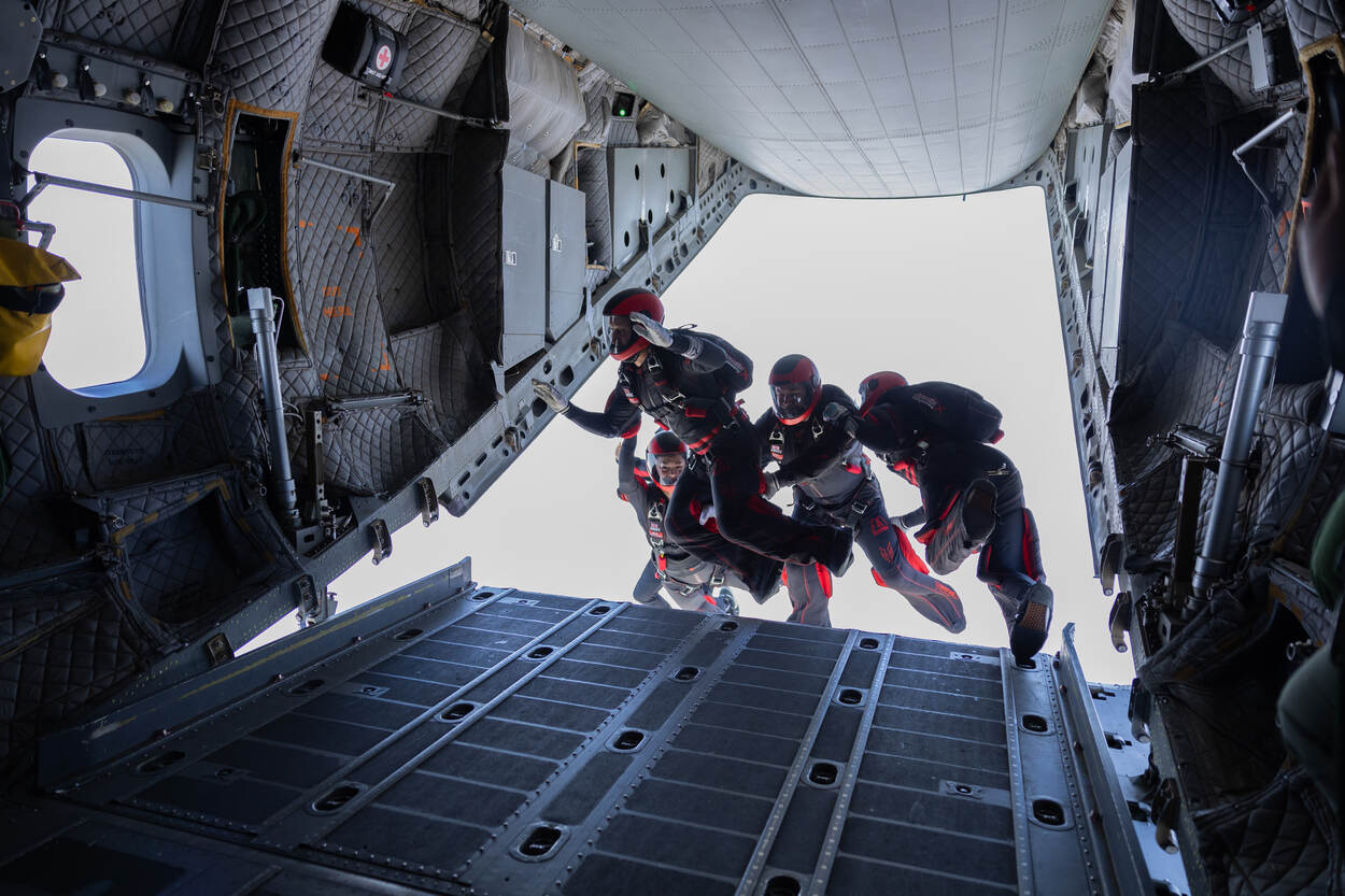 Vier militairen in een donker overal en met helm op springen achteruit een C-27 Spartan.