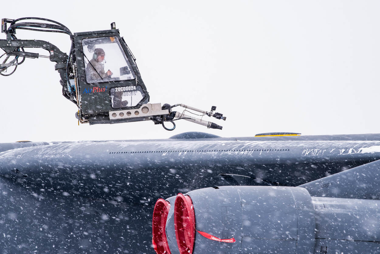 Een zogenoemde de-icing truck, wat lijkt op de cabine van een heftruck, hangt boven een B-52H Stratofortress om zo het ijs van de kist te halen.
