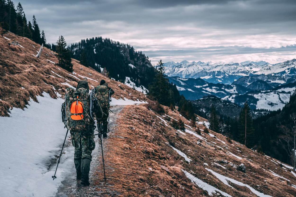 Twee militairen wandelen met korte ski’s op hun rug en skistokken in de hand door de besneeuwde Oostenrijkse bergen.