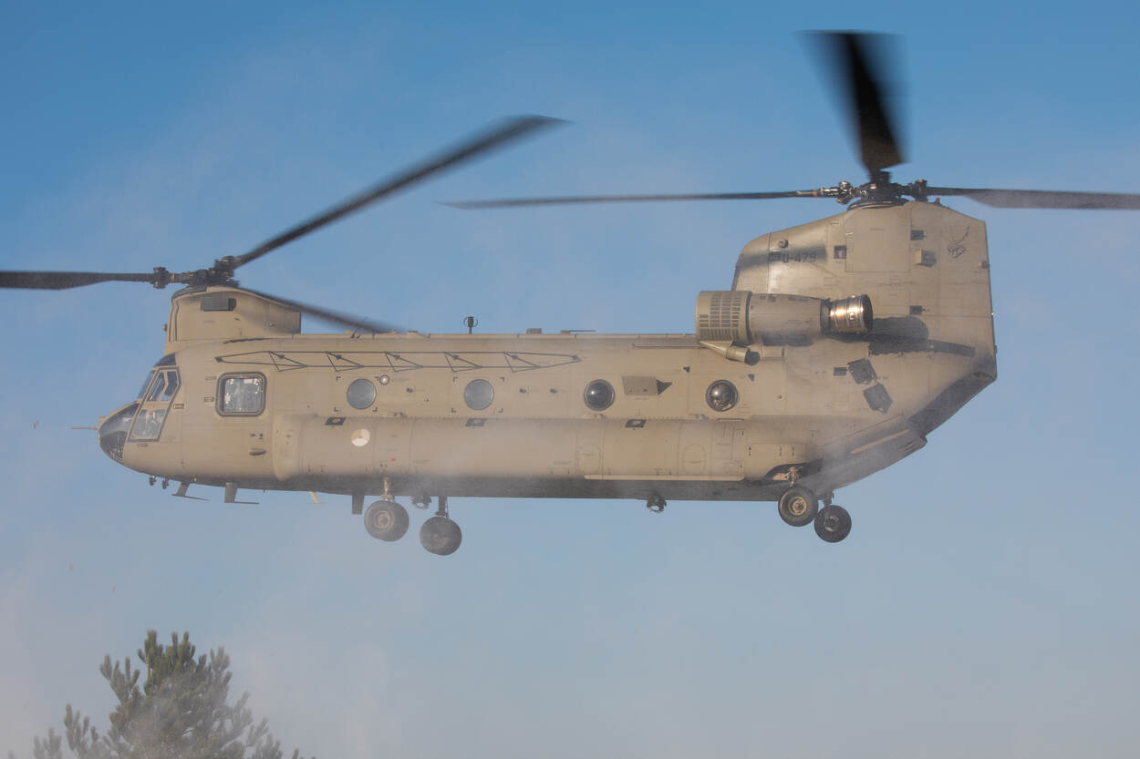 Een grijze CH-47 Chinook van 298 Squadron, met op de achtergrond een helderblauwe lucht, laat sneeuw opwaaien.