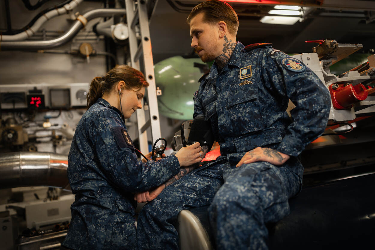 Pien, afgestudeerd MBO-Verpleegkunde (met HBO-specialisatie psychiatrie), fungeert tijdelijk als walondersteuner voor de logistieke dienst aan boord en als ziekenverpleger van Zr.Ms. Bruinvis. “Het verschil met boven water is dat je tegen andere zaken aanloopt. Ja, ook letterlijk in die kleine ruimte. Op de Groot Bovenwaterschepen kun je terugvallen op een arts aan boord. Op een onderzeeboot ben je als korporaal grotendeels op jezelf aangewezen of op contact met de wal.”