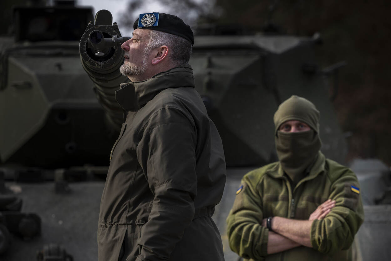 De Oekraïense militair Andrej, een tolk en instructeur Rik zitten op een Leopard 1a5-gevechtstank.