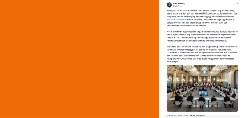 “Het is allereerst essentieel om te gaan leveren wat we beloofd hebben en om te kijken wat we nog meer kunnen doen”, reageerde demissionair premier Mark Rutte maandag op X. Het gaat volgens een woordvoeder om nieuw geld waar afgelopen week overeenstemming over is bereikt.
