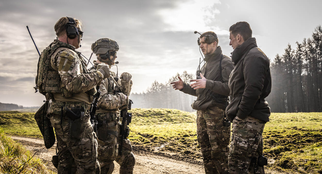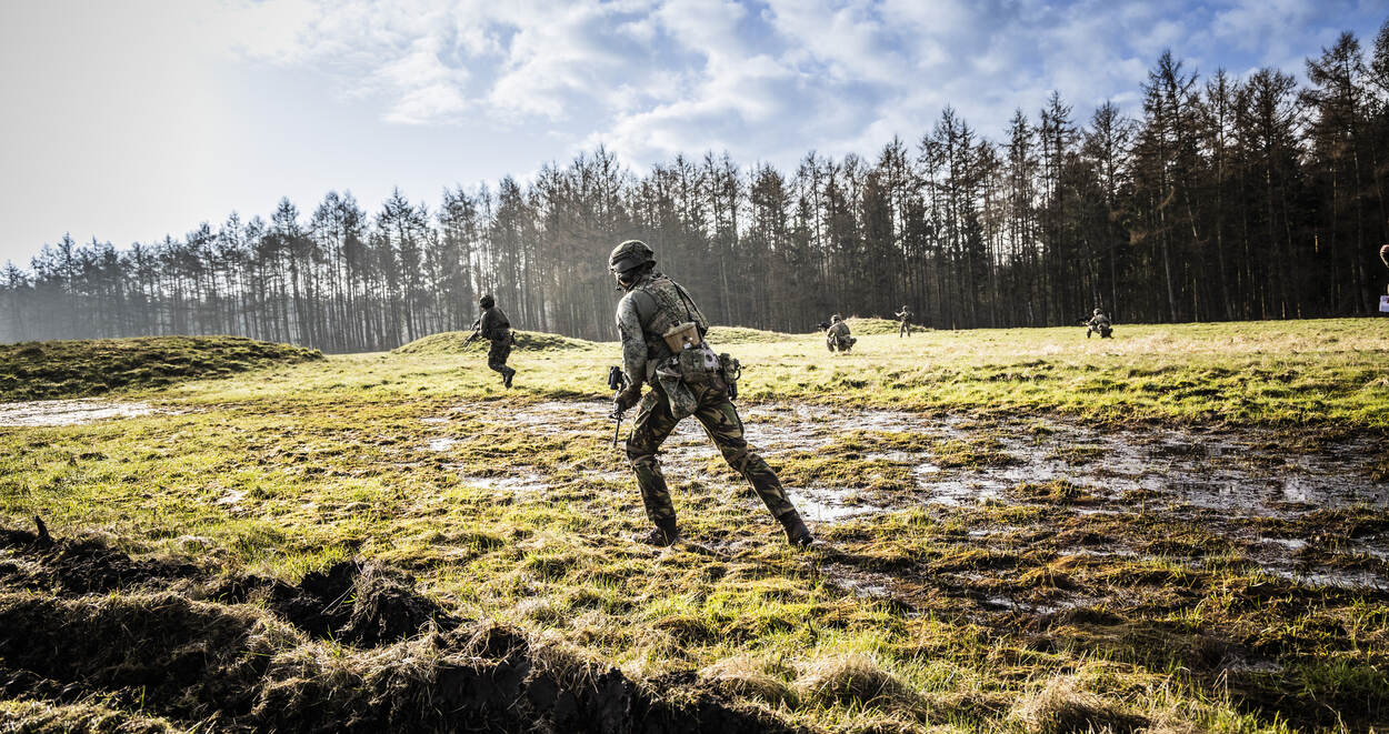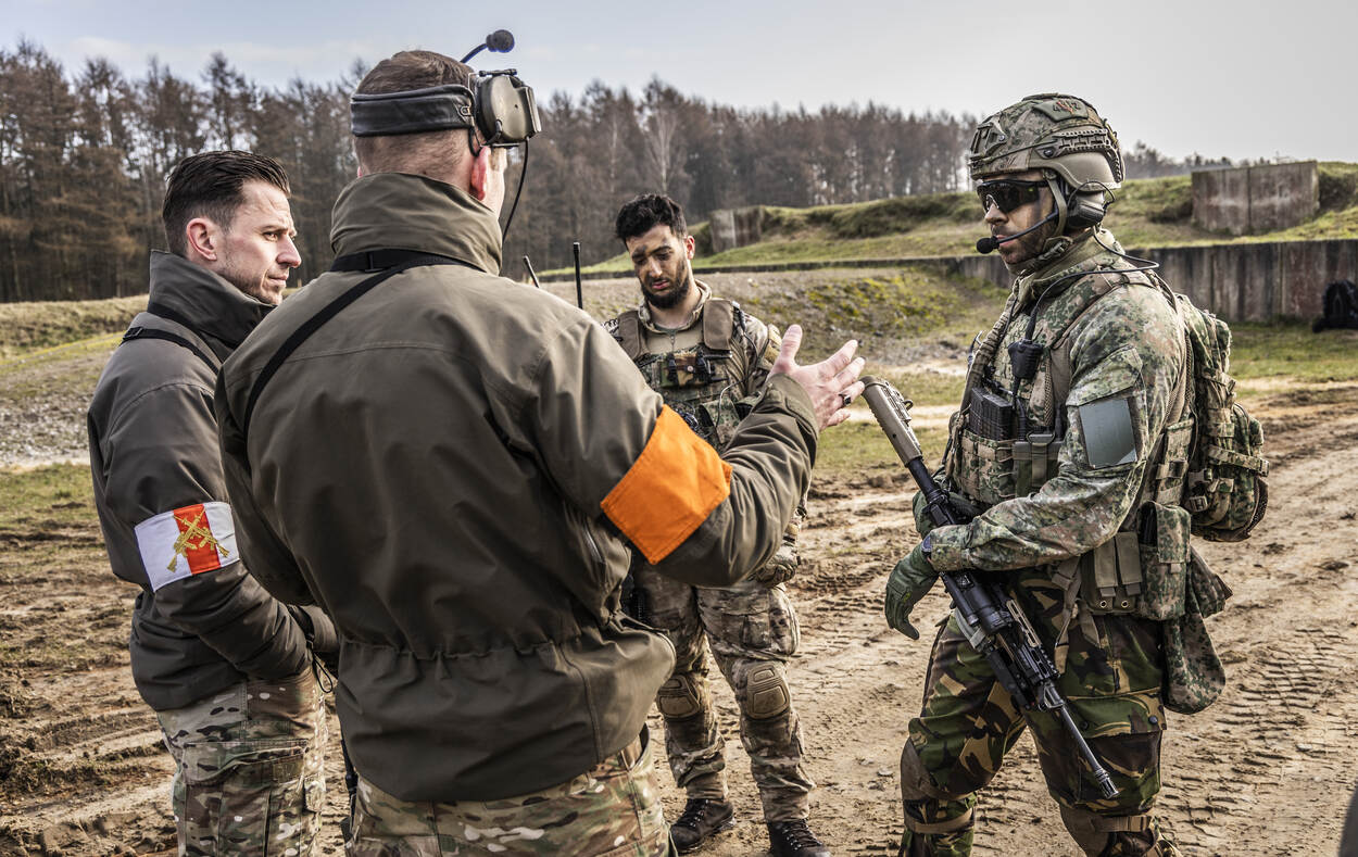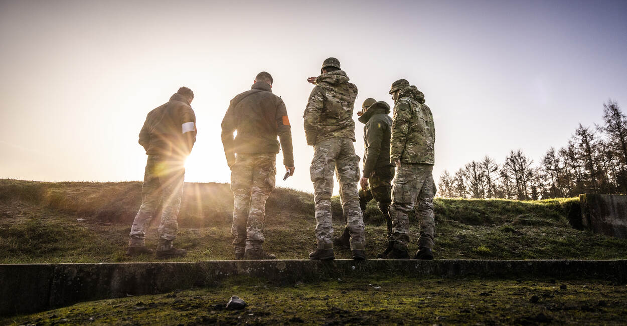 De eerste groep maakt zich klaar om het veld in te gaan. Het uit de lucht schieten van de drone is volgens sergeant-majoor Roel Hoogervorst maar een klein deel van de oefening, dat je relatief snel onder de knie hebt. “Terwijl het tactische deel telkens terugkomt op verschillende niveaus, door de jaren heen. Denk daarbij aan: hoe manoeuvreren we als groep, wie doet wat als er een drone aan komt of welke wapens gebruiken we op welk moment op welke vijand.”