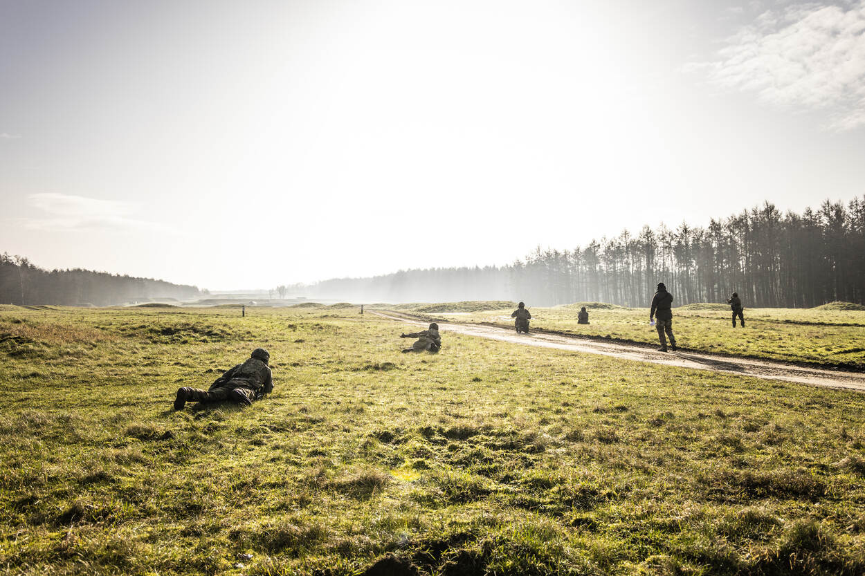 De groep beweegt zich voort en neemt ondertussen de klapschijven onder vuur die verderop in het veld vijandelijke troepen uitbeelden. De vele heuveltjes in het veld vormen een uitstekende dekking.