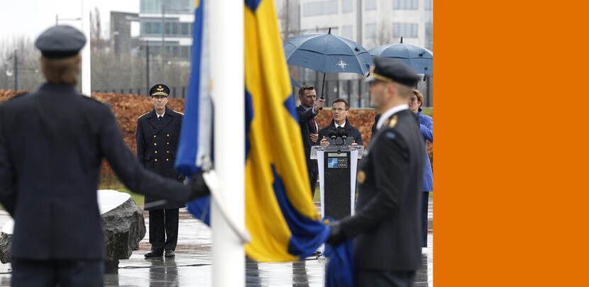 Volgens Kristersson heeft de veiligheid van het land sinds de Tweede Wereldoorlog niet meer zo onder druk gestaan als nu. “We hijsen de vlag met de brede steun van ons parlement en onze bevolking", zei Kristersson in de stromende regen. Naast hem stonden de Zweedse kroonprinses Victoria en NAVO-chef Stoltenberg.