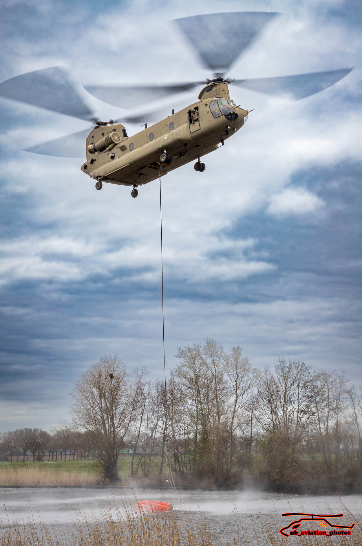 Een staande foto van een Chinook die stil hangt boven een meertje en een grote ‘watertas’ naar beneden laat om water in te scheppen,.