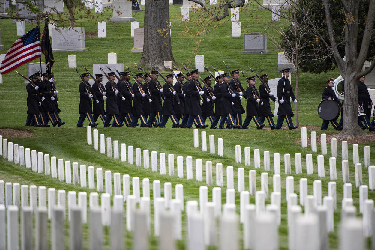 Een peloton van de Amerikaanse infanterie loopt langs de graven van Arlington.