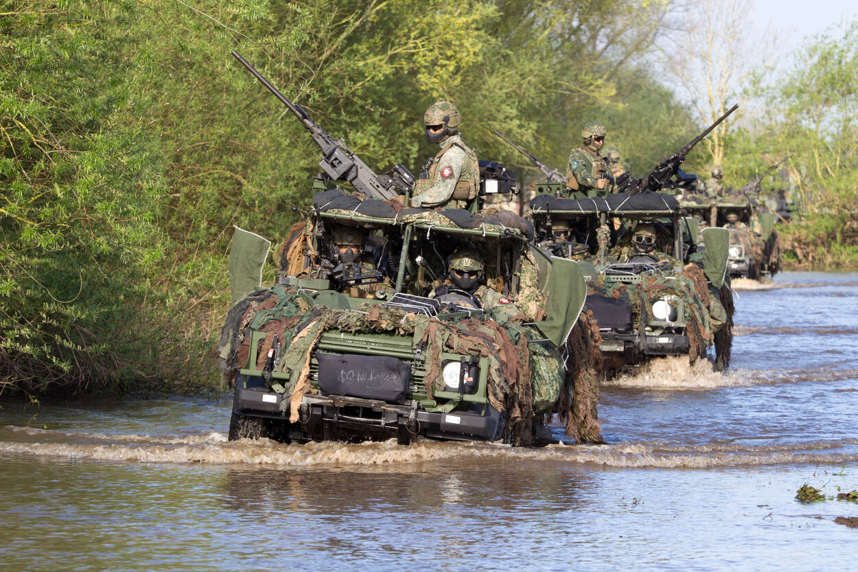 Gecamoufleerde militairen rijden in hun voertuigen door het water,