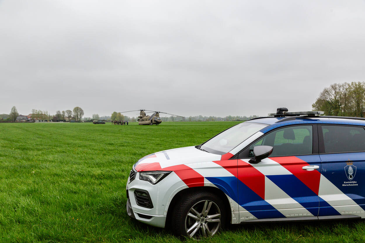 Een weiland met op de voorgrond een voertuig van de marechaussee en op de achtergrond een Chinook aan de grond.