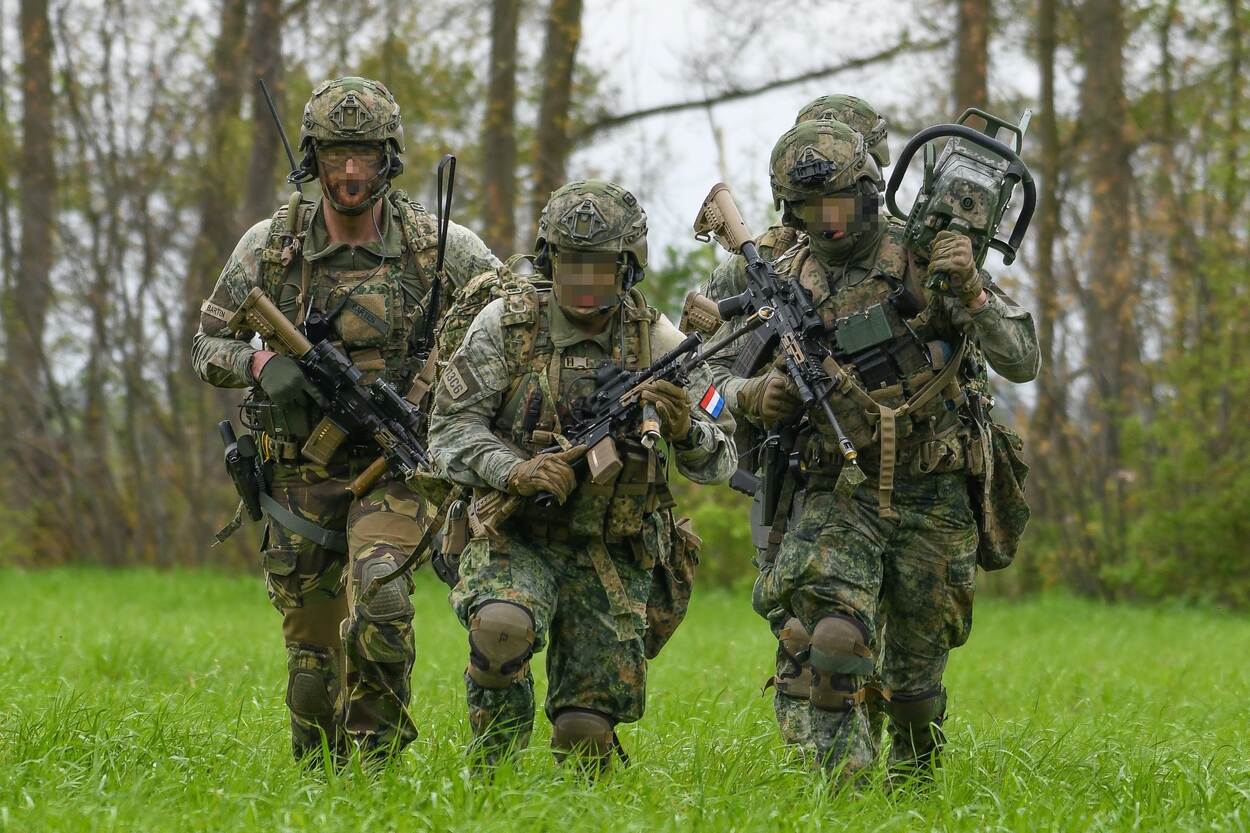 Drie militairen lopen bewapend door het gras.