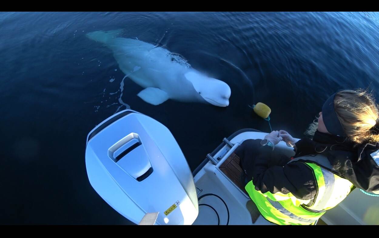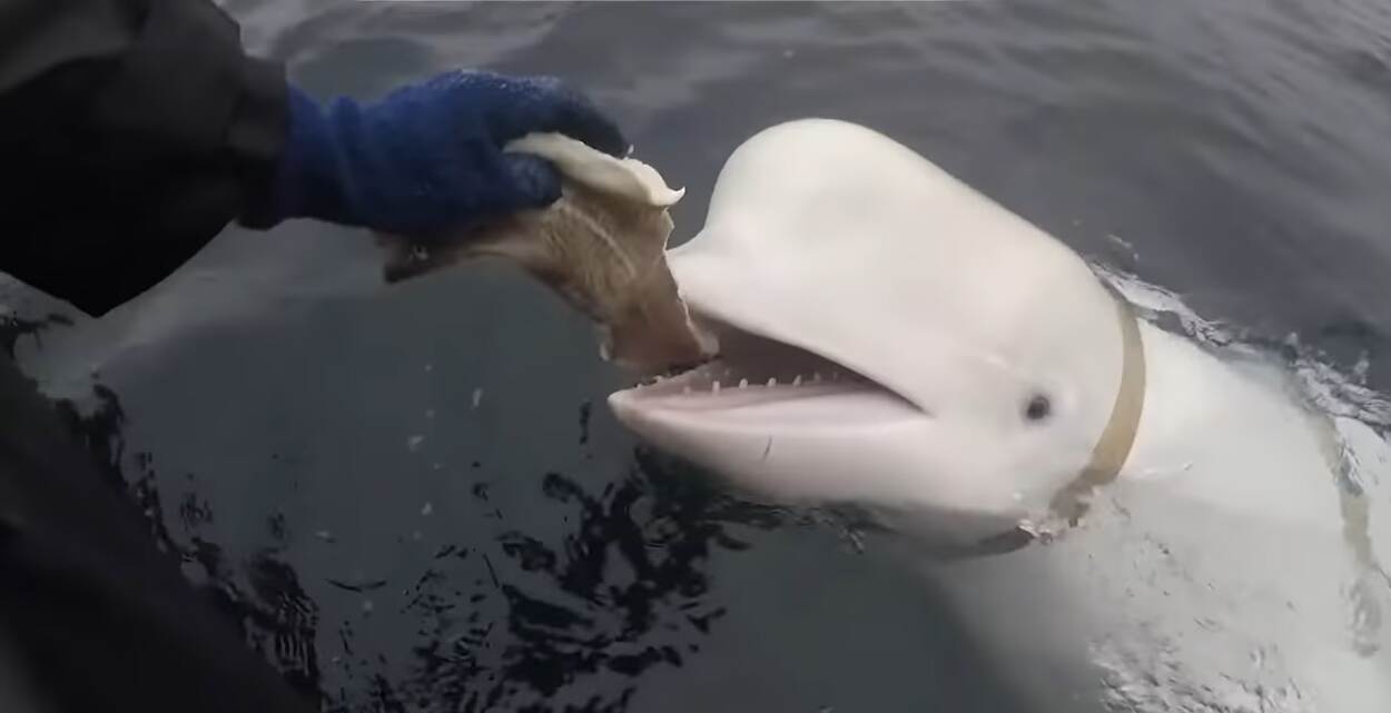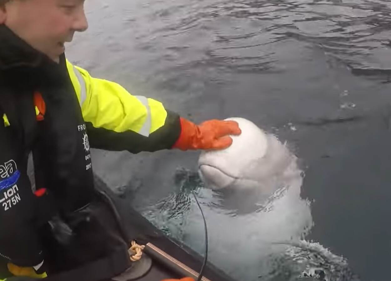 Screenshot van Hvaldimir terwijl hij wordt gevoerd.