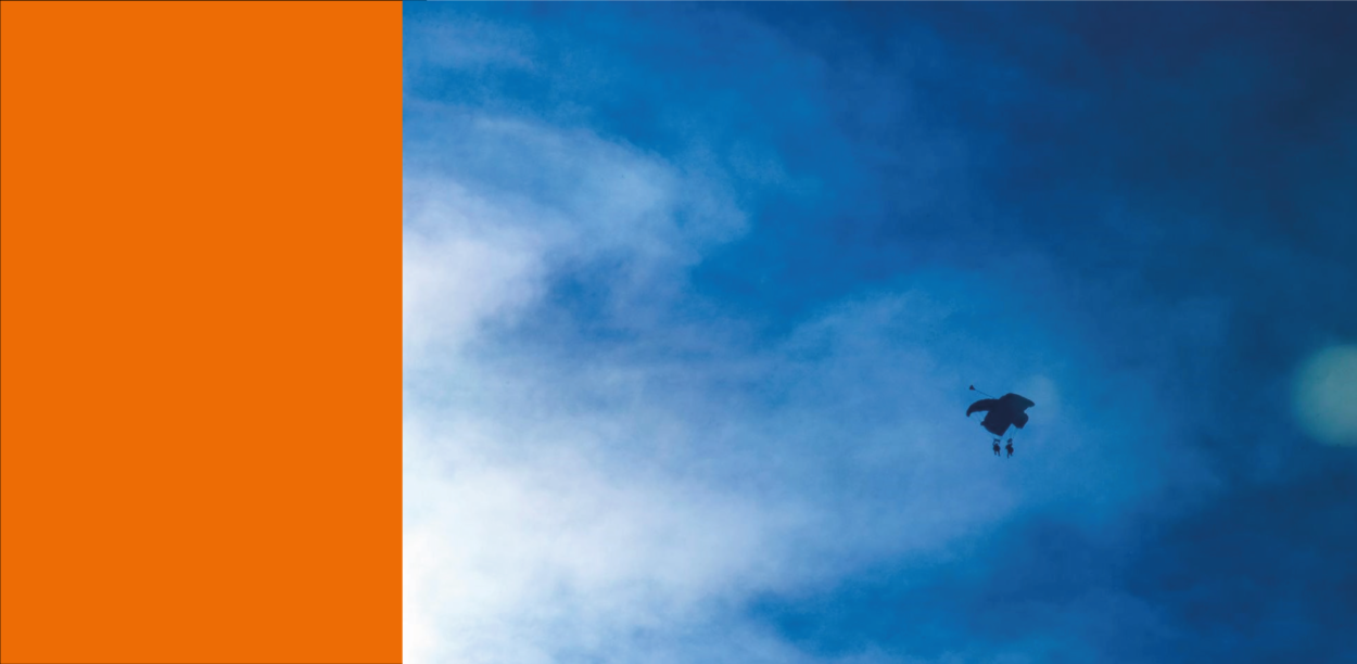 Twee parachutisten met uitgeklapte parachute tegen een helderblauwe achtergrond.