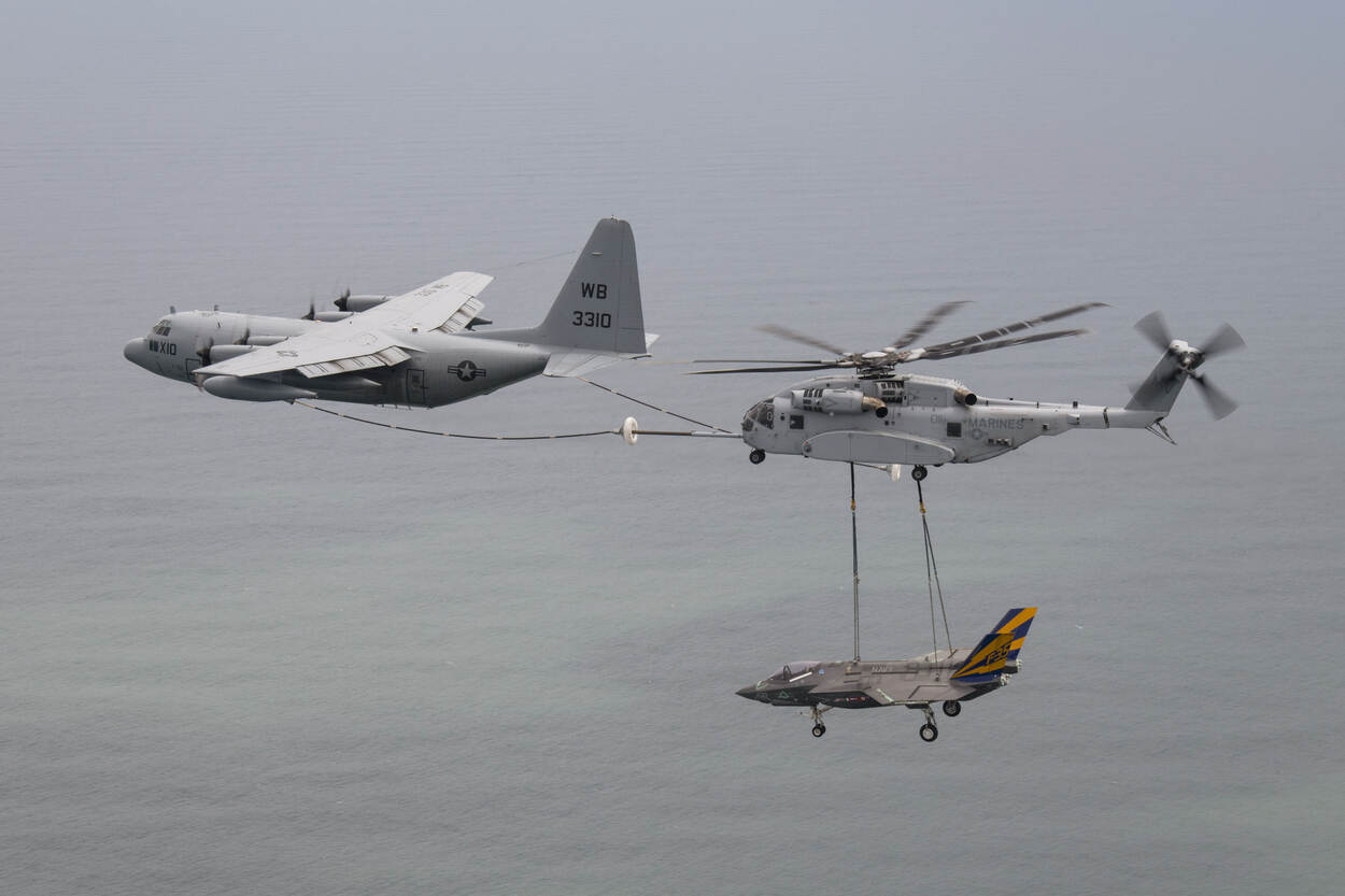 Noem het geen sensationele foto: een CH-53K King Stallion met een uitgeklede F-35 als underslung, onderweg bijgetankt door een KC-130T Hercules. De King Stallion van het Marine Test and Evaluation Squadron 1 was onderweg van marinebasis Patuxent River naar het Naval Air Warfare Center Aircraft Division in Lakehurst. Hier zal de Lightning II voor testdoeleinden worden gebruikt.