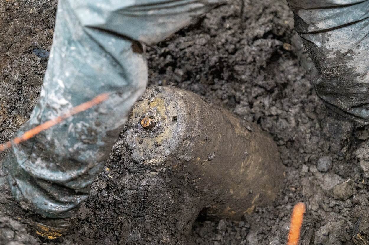 Nadat de bom gedeeltelijk is blootgelegd is slechts een heel klein stukje van de ontsteker zichtbaar.