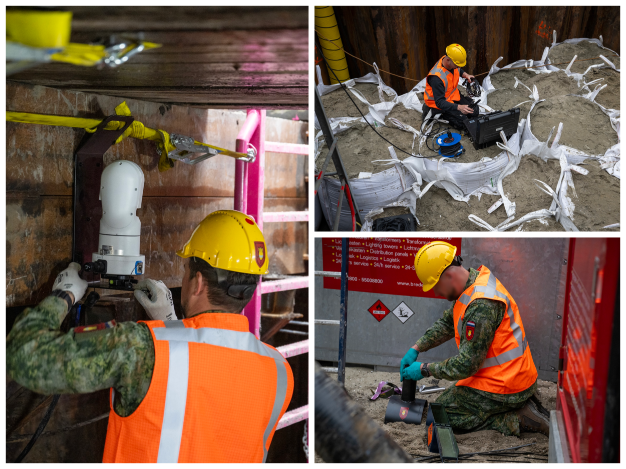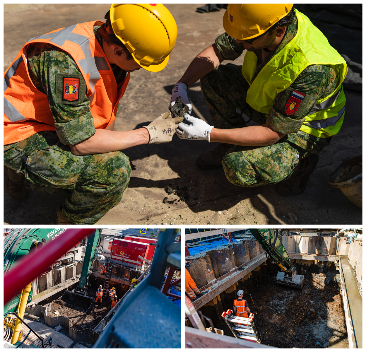 Medewerkers van de EOD treffen voorbereidende werkzaamheden in en rond de bouwput.