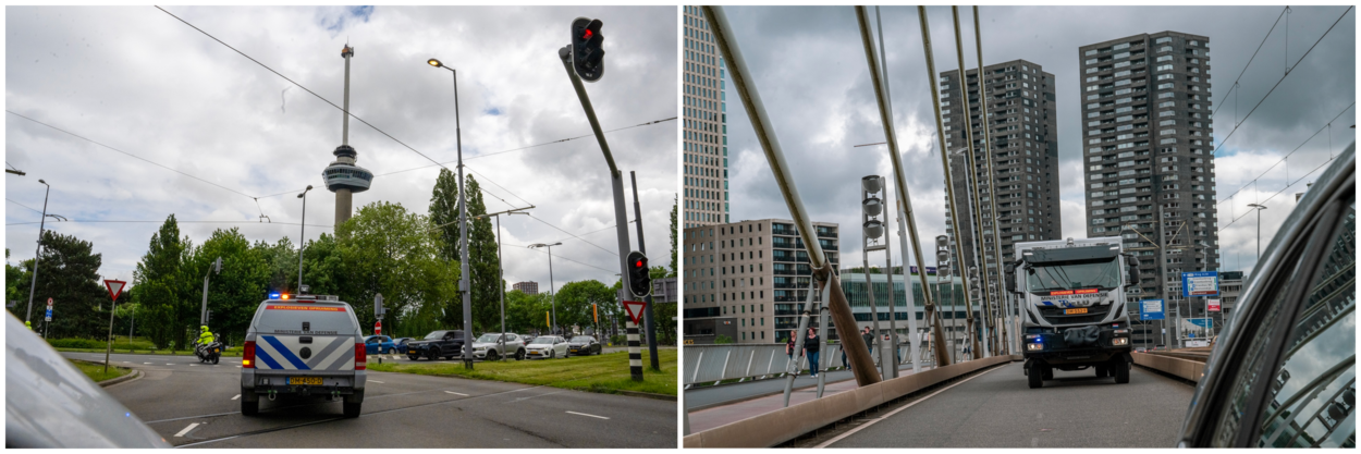 Twee foto’s van de EOD-vrachtwachten die rijdt langs de Euromast en over de Erasmusbrug