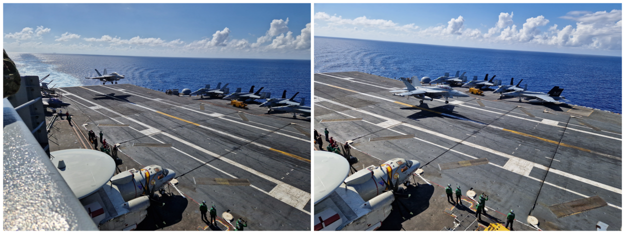 Op het moment van interviewen vaart het tweetal in de Río de la Plata, een monding van twee rivieren in de Atlantische Oceaan bij Uruguay. De route die ze afleggen is op z’n zachtst gezegd uniek te noemen. Omdat de USS George Washington vanwege de diepgang niet door het Panamakanaal kan, vaart het schip helemaal om Chili en Argentinië heen. En die moeite wordt niet snel genomen.