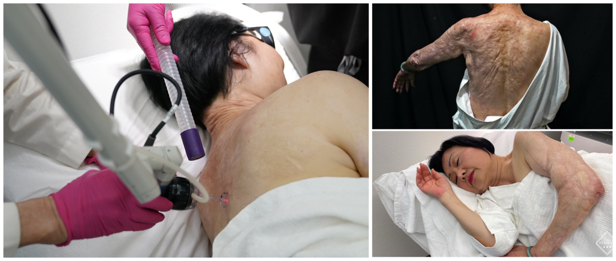 Een arm en rug vol littekens en een foto van de rug van de vrouw waarop een laser is gericht.