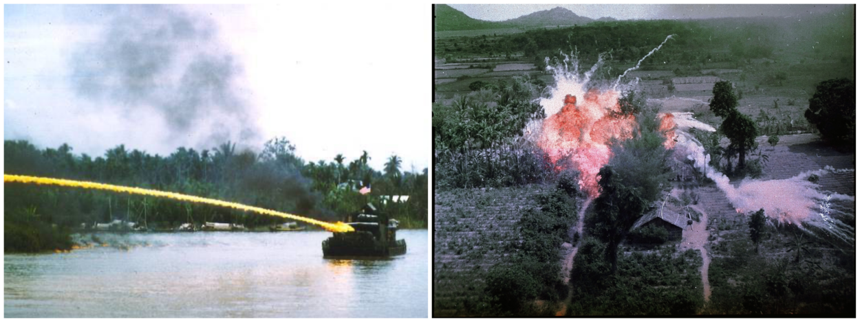 Foto links: napalm wordt afgeschoten vanaf een rivierboot tijdens de Vietnamoorlog. Foto rechts: napalmexplosie tijdens de Vietnamoorlog, vlakbij Saigon.