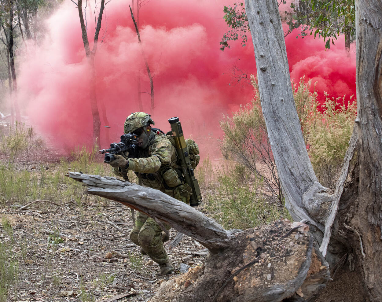 Wie de wedstrijd wil winnen, moet trainen, trainen, trainen. Rookbommetjes maken het decor soms nóg realistischer. Ruim honderd kilometer boven de Australische stad Melbourne ligt het militair trainingsgebied Puckapunyal. Daar schoot korporaal Daniel Bozza deze actiefoto van een Australische cadet van het Royal Military College uit Duntroon. De officieren in spe trainen er hun vaardigheden in het leiden van een peloton in offensieve en defensieve operaties.