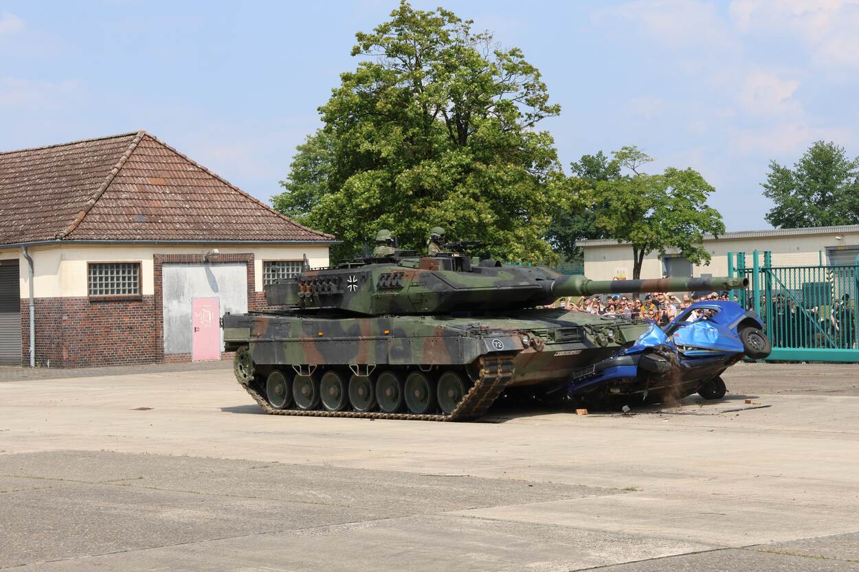 Dennis Boom stuurt wel vaker bijzondere foto’s in voor deze rubriek. Ditmaal was hij aanwezig op een familiedag van het Duits-Nederlandse 414 Tankbataljon. Er waren diverse static demo’s te bewonderen, maar volgens Dennis was de dynamic demo van de Leopard het meest spectaculair. Behendig showde de chauffeur onder meer de wendbaarheid, snelheid en noodstop van het voertuig. Ook twee auto’s werden vakkundig vermorzeld. Zo ook de oude blauwe auto van bataljonscommandant luitenant-kolonel Bas Schillemans. “Menig dienstplichtig huzaar heeft warme herinneringen aan deze demo, die op de ouderdagen van weleer ook altijd onderdeel van de dag was”, vertelt Dennis.