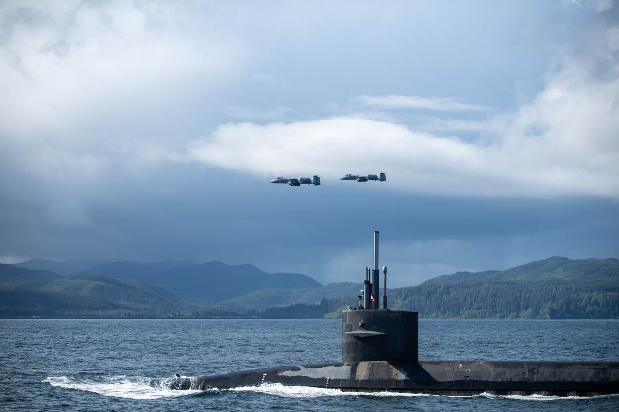 Een bijzonder beeld van USS Nebraska (SSBN 739) en twee A-10 Thunderbolt II-jachtvliegtuigen van de Amerikaanse luchtmacht. De onderzeeboot uit de Ohio-klasse voer door de Straat van San Juan de Fuc en werd daarbij begeleid door bijzondere vliegtuigen en escorteschepen van de Amerikaanse kustwacht. Gezamenlijke operaties, zoals deze waarbij de luchtmacht, de kustwacht en de marine betrokken zijn, bereiden het Amerikaanse defensieapparaat voor op inzet in binnen- en buitenland.