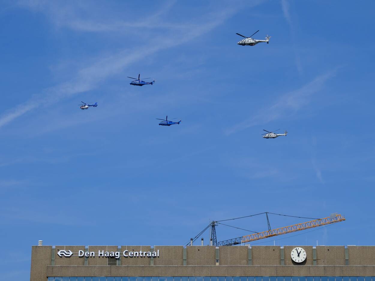 De laatste foto in deze rubriek van Veteranendag komt uit een heel andere hoek. Dit beeld van vijf helikopters boven het station Den Haag Centraal werd genomen door de Haagse hobbyfotograaf Jan Hartsink. Hij zag daar hoe een EC135 (voor) en twee AW139's van de politie en twee NH90’s (860 Squadron) van Defensie voorbijvlogen tegen het decor van een strakblauwe hemel.