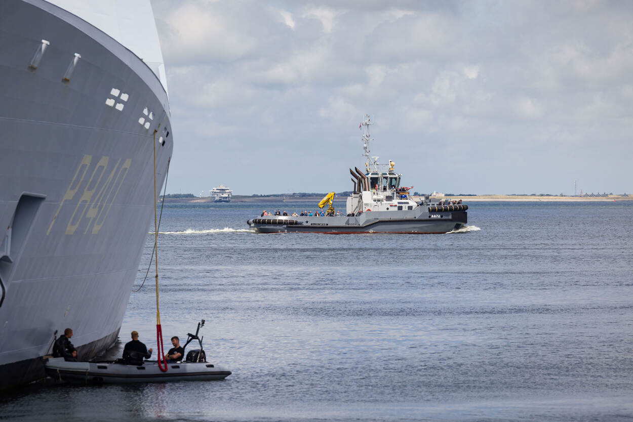 De sleper Waddenzee vaart met bezoekers langs Zr.Ms. Holland in de haven van Den Helder.