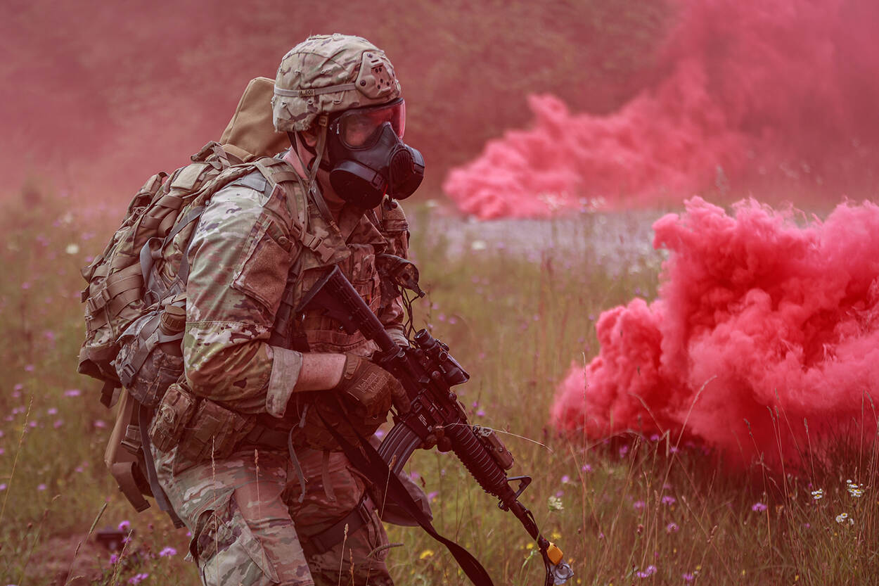 Een militair met gasmasker op loopt door een rode rookwolk, die traangas moet simuleren.
