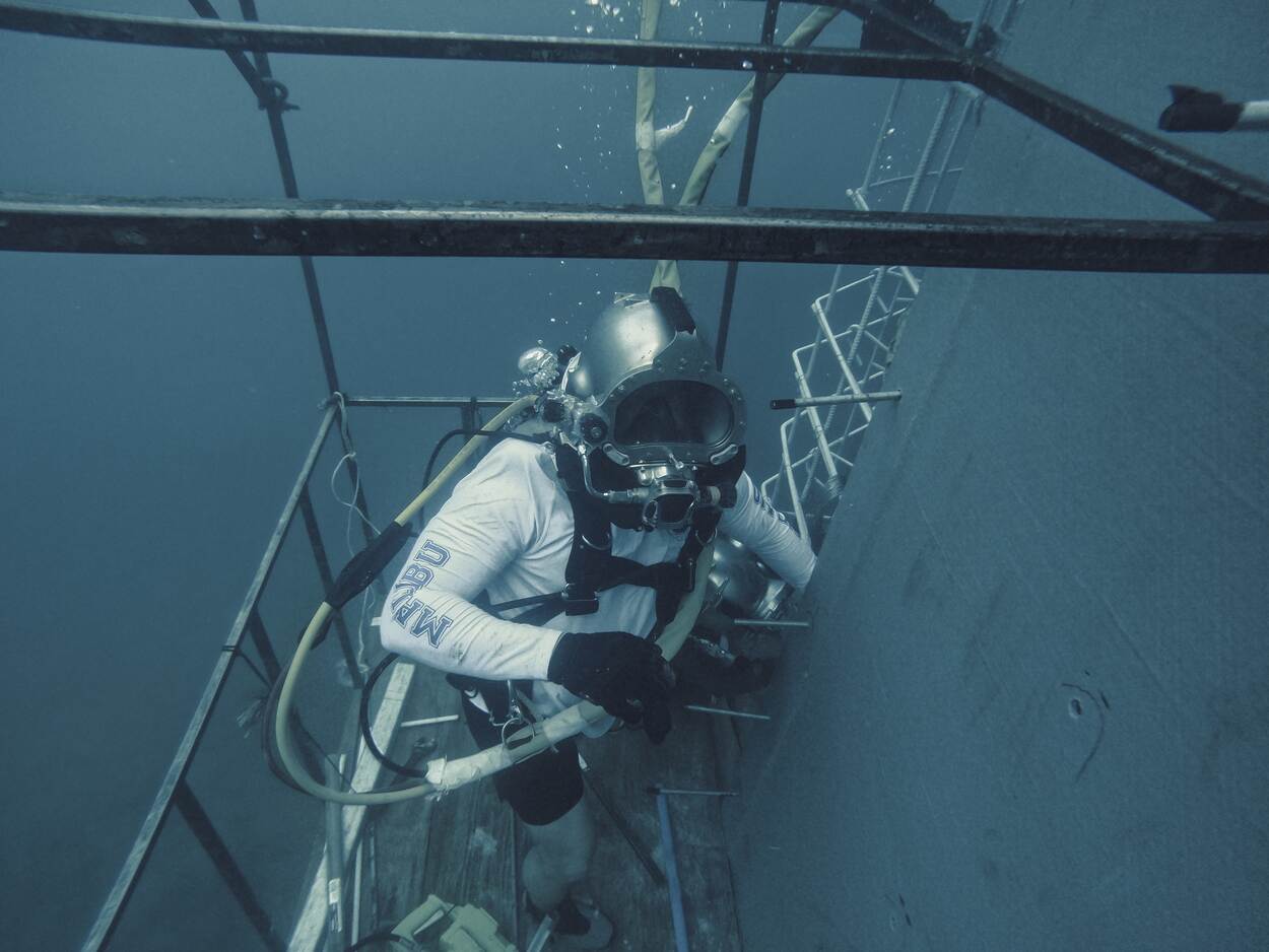 Een duiker van Underwater Construction Team Two van de Amerikaanse marine voert reparaties uit aan de kademuur van de haven van Malakal. Tijdens de oefening Valiant Shield 24 (VS24) in Koror, hoofdstad van de republiek Palau in Oceanië, zet het team zich in om de belangrijkste commerciële haven van Palau te verbeteren. VS24 is een multinationale, tweejaarlijkse oefening rond Guam, de Noordelijke Marianen, Palau, en het grote oefen(zee)gebied Mariana Island Range Complex. (Foto: sergeant Nello Miele)