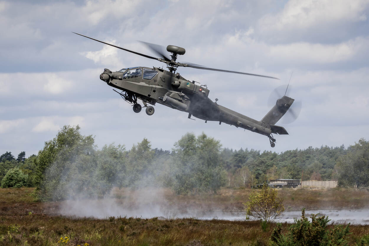 Een Apache vliegt vlak boven de grond.