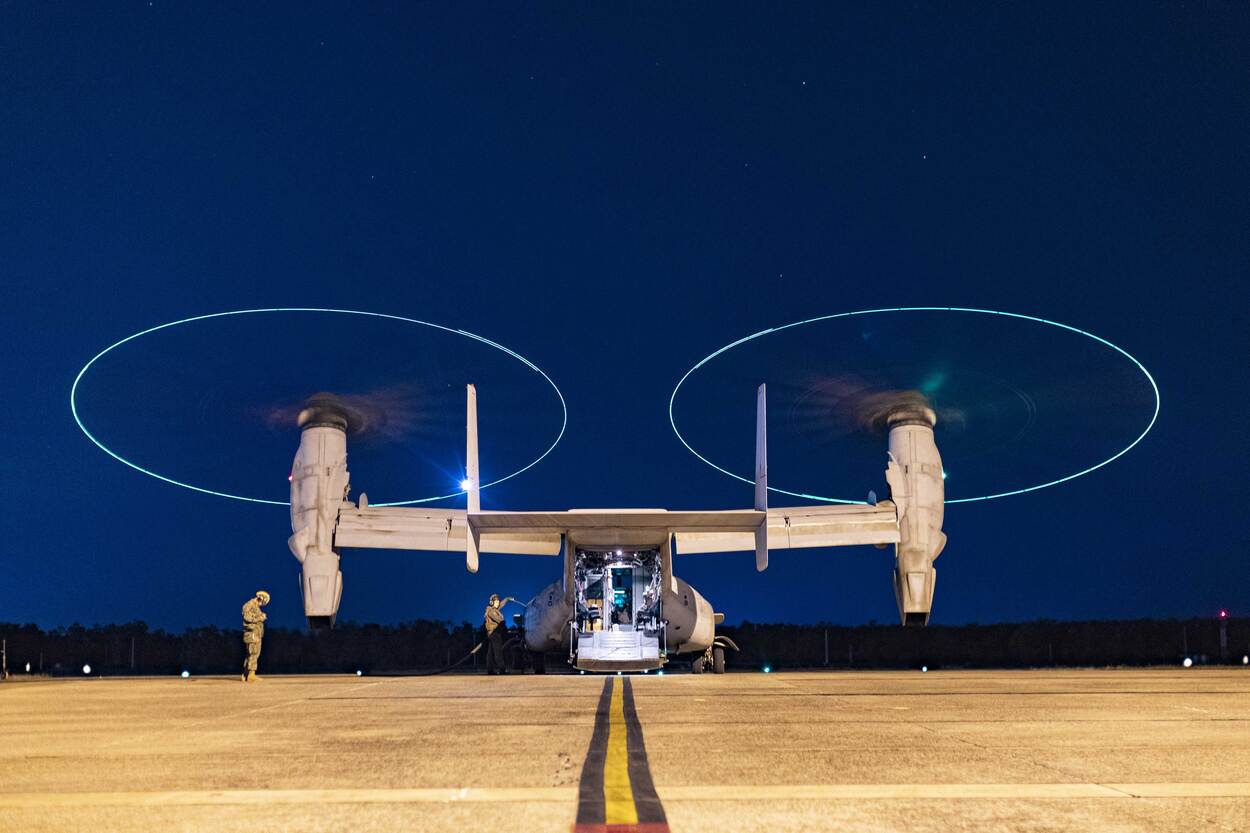Mariniers voeren een preflight-inspectie uit op een MV-22B Osprey tijdens Predator's Run op Royal Australian Air Force Base Darwin. Predator's Run is een internationale oefening in het Northern Territory en op Melville-Eiland, onderdeel van de Tiwi Islands in de oostelijke Timorzee. Daaraan doen onder meer Amerikaanse mariniers en Britse commando’s van 40 Commando Royal Marines mee. De oefening duurt nog tot 7 augustus. De foto is trouwens gemaakt door sergeant van de mariniers Cristian Bestul.