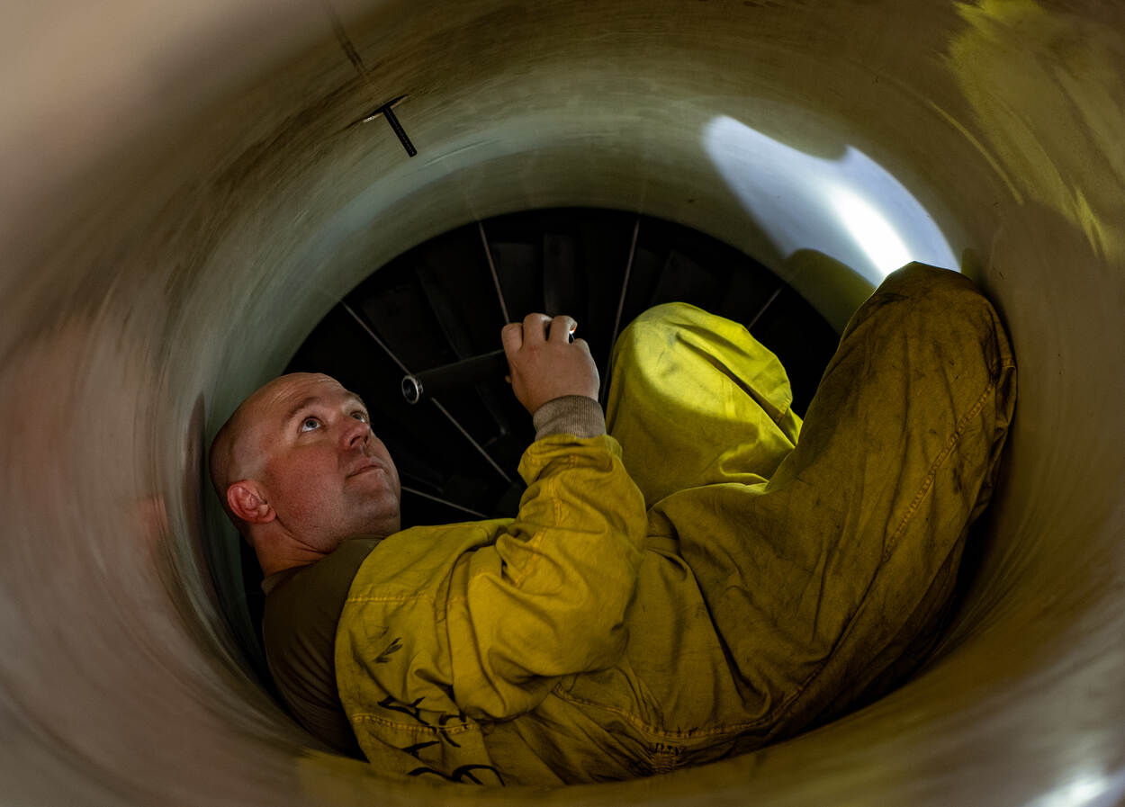 Sergeant-majoor Dennis Gifford, crewchief van het 13th Fighter Generation Squadron, voert een inspectie uit op een F-16 tijdens de oefening Valiant Shield 2024. De foto van André Medina is genomen op Misawa Air Base in Japan. De enorme oefening had plaats in de Zuid-Chinese en Filipijnse Zee. Onder meer het vlootverband rond vliegdekschip USS Ronald Reagan was erbij betrokken.