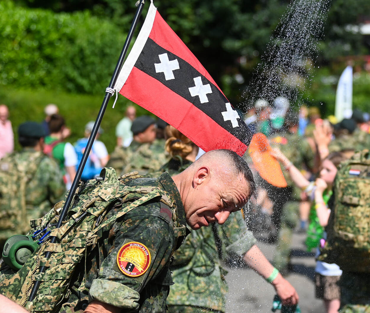 Dat we op deze foto van majoor Fred Warmer niet hebben te maken met Rotterdammers is wel duidelijk. Soldaat 1 Blom is natuurlijk van het Vierdaagse-detachement Amsterdam, 20 Infanteriebataljon Bewaken en Beveiligen Korps Nationale Reserve. Zoals zovelen zocht de reservist precies voor de camera van Fred verkoeling langs de route op de derde en warme marsdag van de Nijmeegse 4Daagse 2024.