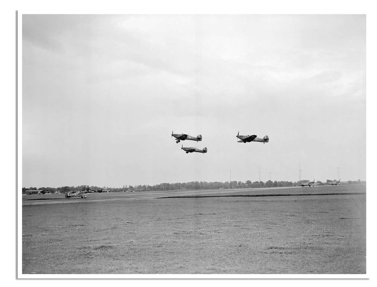 Een vlucht van Hawker Hurricanes van No. 151 Squadron RAF stijgt op vanaf North Weald (Essex). Onder hen taxiën Hurricanes van 56 Squadron naar het noordelijke uiteinde van de hoofdbaan. Op de achtergrond de zendmasten van het GPO-radiostation in Weald Gullet. Foto: Imperial Warmuseum.