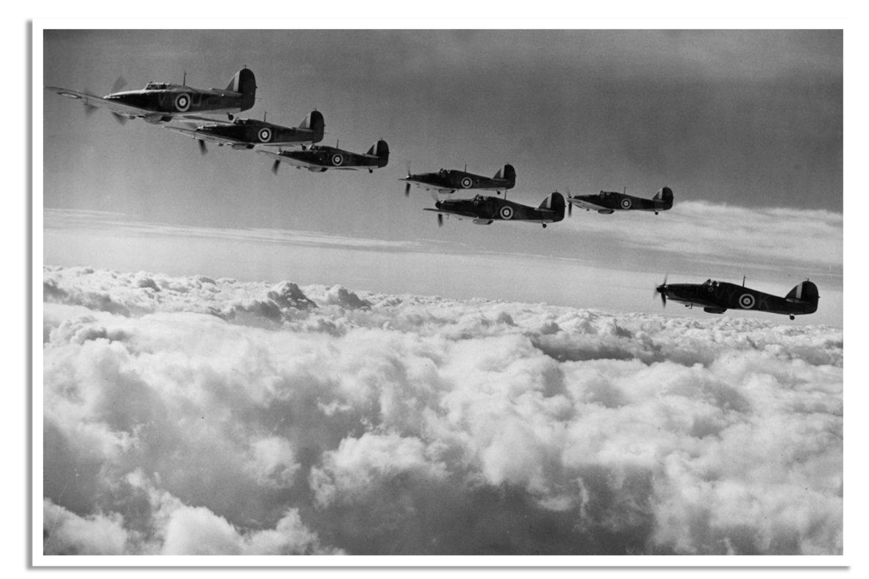 Vier Hurricanes Mark I tijdens de Tweede Wereldoorlog. Foto Imperial Warmuseum.
