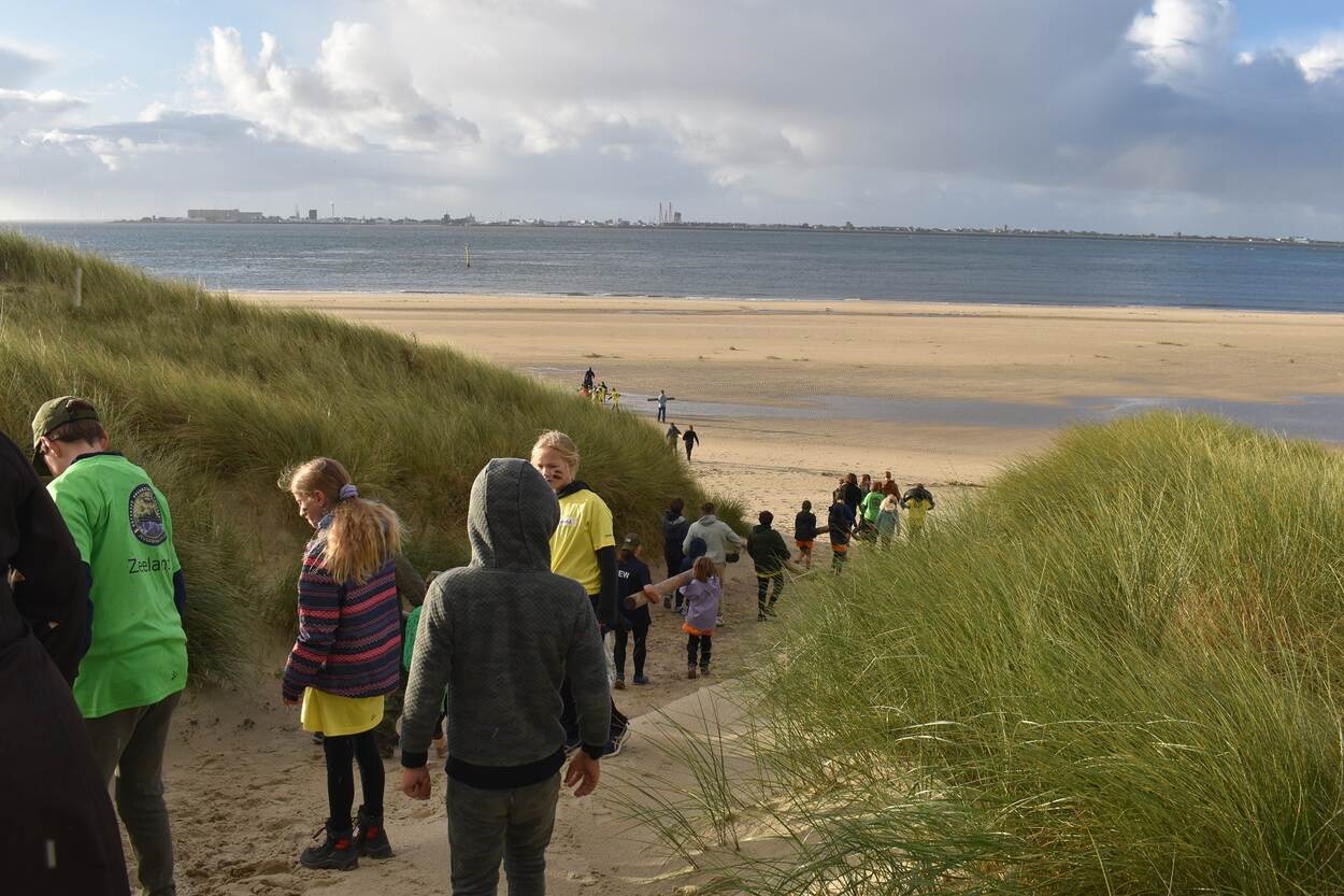 De kinderen volgen op het strand instructies van de instructeurs met daaromheen andere begeleiders
